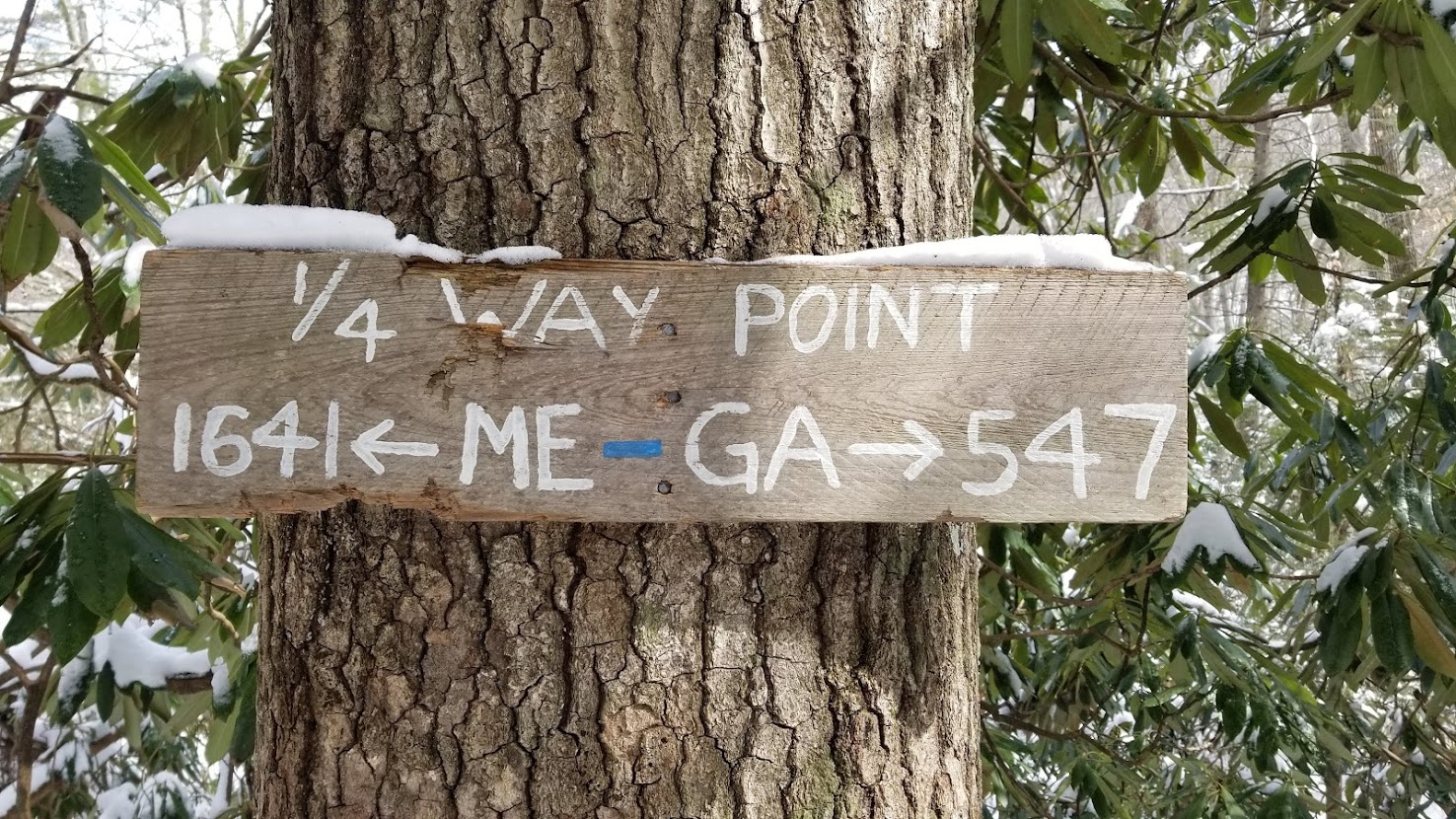 Scratch was good company and a powerful hiker. We spent the day chatting while pushing past another 20-mile marker before stopping near Millboro, VA, where we spent the night in an old school house from the 1800s that was open to hikers. There were lots of old buildings like these on the AT, and it was fun to learn about the region’s history. Scratch and I parted ways that morning in favor of me acquiring a bit more miles. The day was challenging: once again alone and breaking trail through snow was tough. I began to feel a nagging pain on the inside of my calf, right above the ankle. This injury intensified and replicated itself on my other leg, making each step as arduous as ever. My experience with tendonitis on the PCT told me this was an overuse injury, likely due to hiking with Altra Lonepeaks for the first time. Much of the Appalachian Trail is within cellphone reception, fortunately, and using my smart phone I was able to self-diagnose myself with posterior tibialis tendonitis, which I promptly treated via stretches and strengthening exercises I found on YouTube over the following days. Otherwise, I was bolstered through the frosty rhododendrons by a new trail sign: at 545 miles in 26 days. I had completed ¼ of the trail!