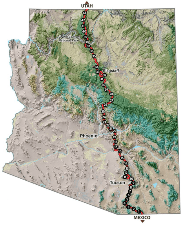 Starting at the U.S.-Mexico border, the path climbs and descends from one “sky island” mountain range to another, gaining and losing thousands of feet in elevation and traversing biomes ranging from desert to boreal forest. Continuing across the Sonoran Desert, the route crosses the Gila River, winds through the Superstition Mountains and the Mazatzal Wilderness on its way to the Mogollon Rim and majestic San Francisco Peaks. The trail north takes travelers across the Grand Canyon through billions of years of geology. Topping out on the North Rim, conifer forests dominate the Kaibab Plateau, eventually giving way to red bluffs dotted with sagebrush as the trail nears the Utah border on the edge of the Vermilion Cliffs National Monument. It is the backbone of Arizona.