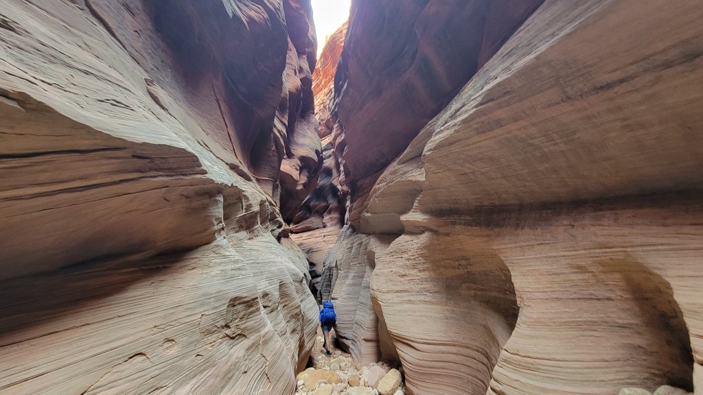 The trail from Wire Pass follows a sandy wash for about 1.5 miles before converging to a narrow slot within the sandstone: the beginning of Buckskin Gulch. This portion of trail is about 13 miles long and has no options for reliable camping or treatable water. It’s also the most scenic portion of the entire canyon and where the slot is the tightest. Occasionally the canyon will open up, but expect to be in the shadows for most of your day on trail.