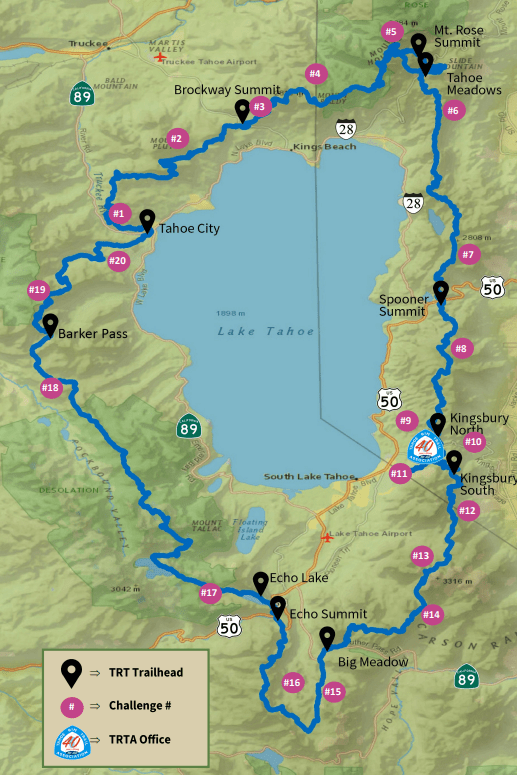 The Tahoe Rim Trail is a 165-mile path that circumnavigates Lake Tahoe. Like Lake Tahoe itself, the trail runs along the border of California and Nevada. Per the Tahoe Rim Trail Association: