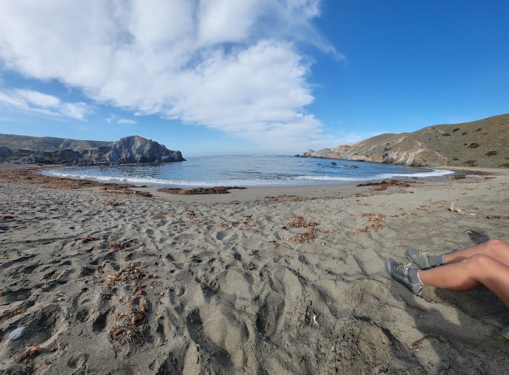 Little Harbor looked like an island oasis, plucked straight from a book. Sure, there were day-use visitors, an RV, and a row of porta potties. There were also palm trees, swaying gently in the breeze, and a gorgeous beach where we enjoyed a mid-morning snack and took our shoes off. It was our own little slice of Baja, if only for 30 minutes or so. We still had about 12 miles more to hike, so we begrudgingly put our shoes back on and began our trek toward Two Harbors.
