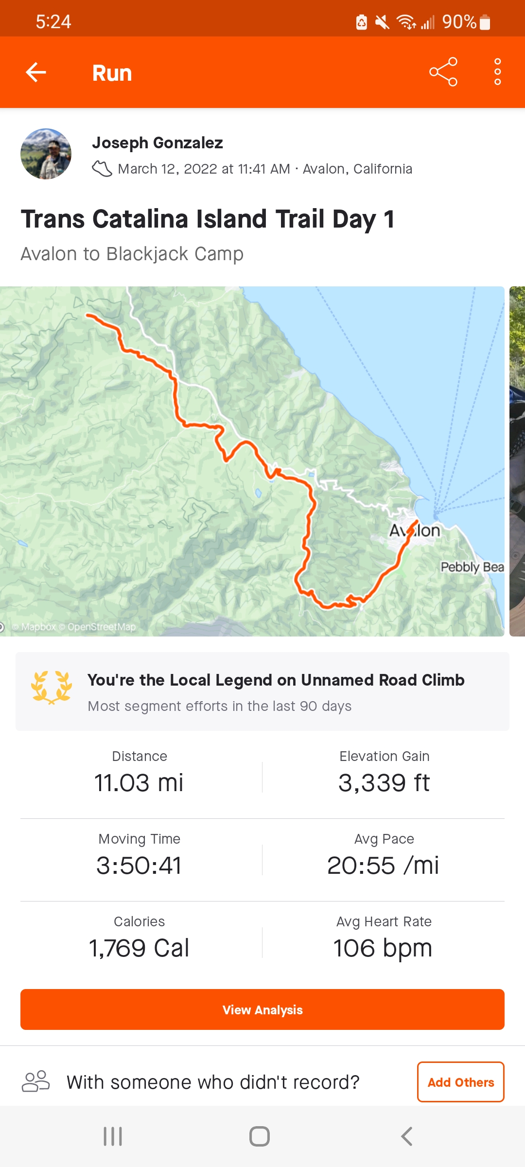 Tynesha and I slept-in and decided to grab breakfast in Avalon before heading out. After all, we only had around 10 miles to hike today. We enjoyed a tasty brunch at the Pancake Cottage before tightening our pack straps and hitting the trail. Our day 1 happened to coincide with the Catalina Island Marathon. We spent the first hour cheering on runners as they sped (or limped) into town. The trail transitioned from pavement to a traditional single-track path once we passed Hermit Gulch Campground, which is a popular place to stay for most hikers once they arrive on the island (we stayed at Seacrest Inn). The trail would take a steep incline from there, pushing us up to a shady lookout with views of Avalon and the surrounding canyon.